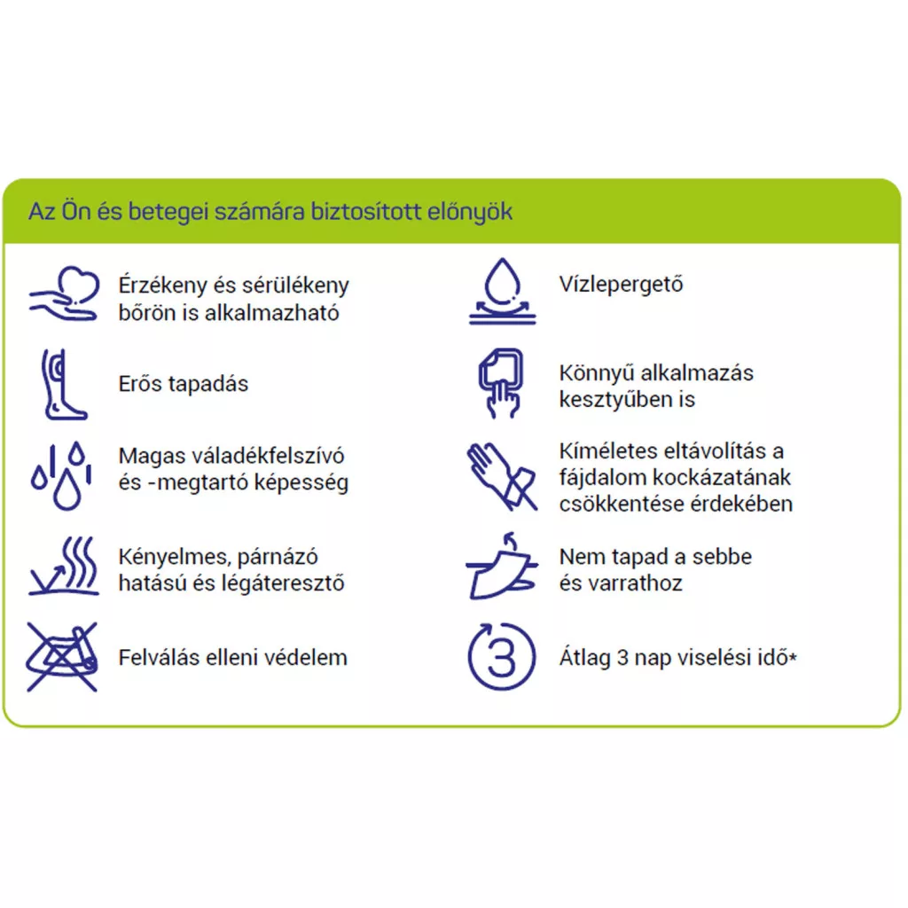 Másrészt, puha szilikon kontaktrétegének köszönhetően a kötés eltávolítása rendkívül kíméletes, csökkenti a további sérülés és fájdalom kockázatát - ideális érzékeny és sérülékeny bőrre.