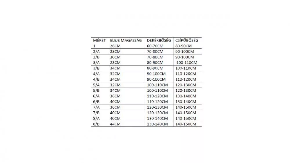3-as: derék 80-90 cm csípő: 100-110 cm magasság: A 28cm B 30cm