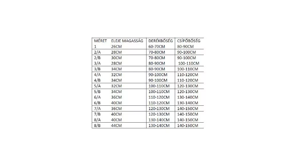 3-as: derék 80-90 cm csípő: 100-110 cm magasság: A 28cm B 30cm