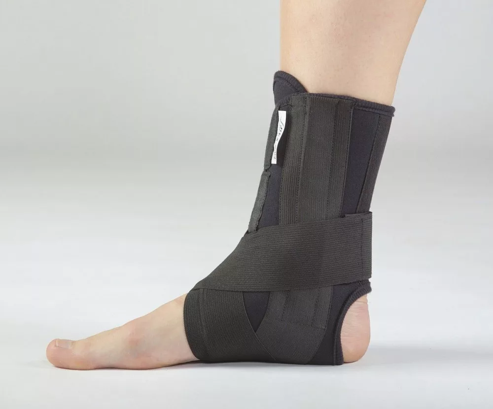 A boka külső és belső oldalán 1-1 formára alakított fémsín helyezkedik el, így biztosítjuk a boka stabil rögzítését. A termék záródása tépőzárral történik. A talp felől a boka felé széles gumipánt van rögzítve, mely keresztben tépőzárral fogható össze. A síneket ne távolítsuk el az eszközből, mert így nem érjük el az oldalirányú támasztást. Tisztításkor figyeljünk, hogy a jobb és bal oldalnak megfelelően tegyük vissza a sínt, amikor mosáskor eltávolítjuk őket. Ügyeljünk, hogy a gumiszalagot folyamatosan feszítve tekerjük 8-as alakba boka körül. A termék könnyen kezelhető, viselése nem okoz allergiás bőrpanaszokat.